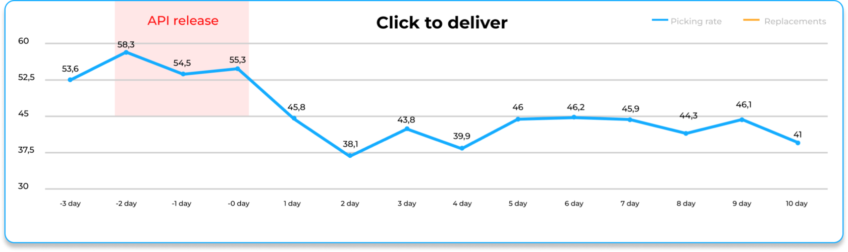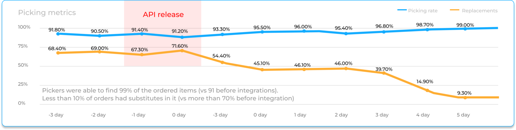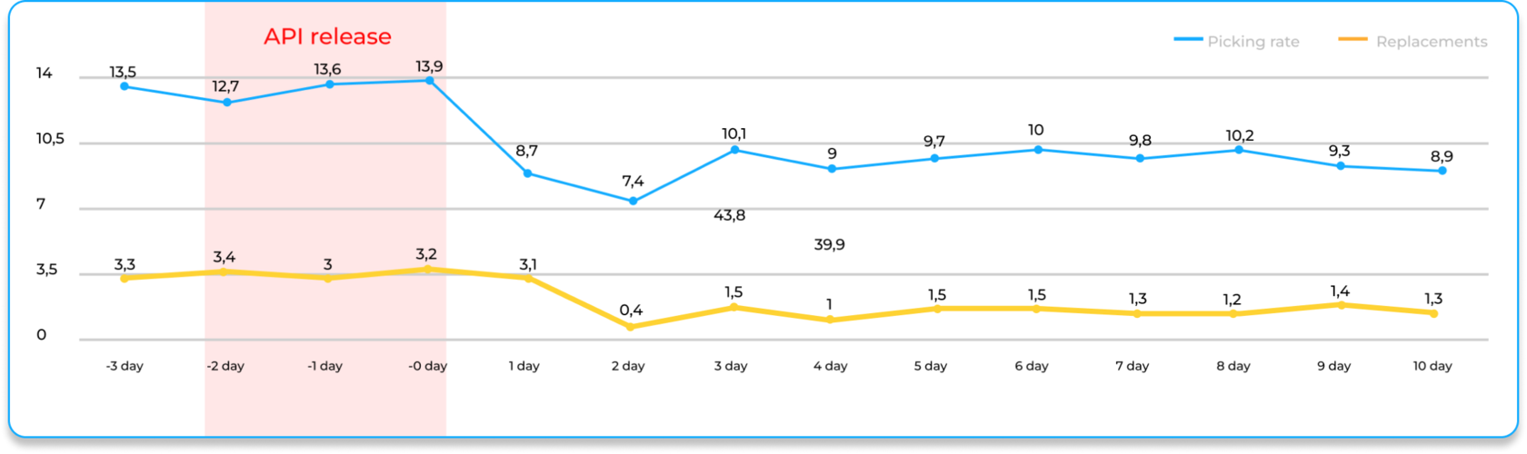Pickers now do less replacements, that is why they take new orders faster and the orders spend less time in a queue. Every employee is now able to do 20% more orders daily.
